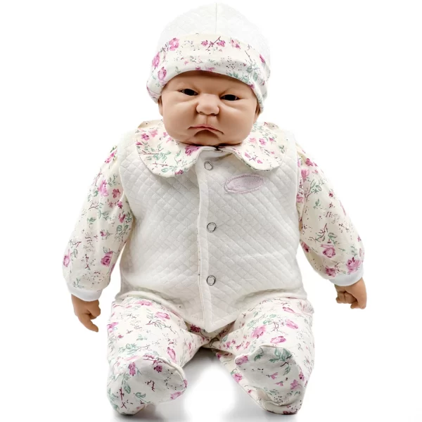 El beboteomás es un muñeco de gran tamaño, confeccionado con materiales de alta calidad que garantizan suavidad, seguridad y realismo en el juego. Su cuerpo está confeccionado en tela batista, relleno con vellón siliconado, lo que lo hace liviano y abrazable. Sus extremidades están realizadas en plastisol suave y flexible, logrando un acabado muy realista.