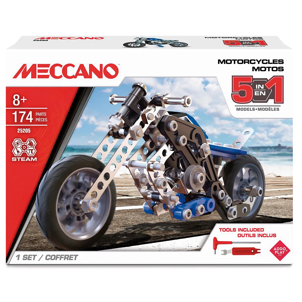 ¡Despierta la imaginación de los jóvenes constructores mientras exploran el mundo de la ingeniería con el set de motocicletas Meccano 5 en 1!