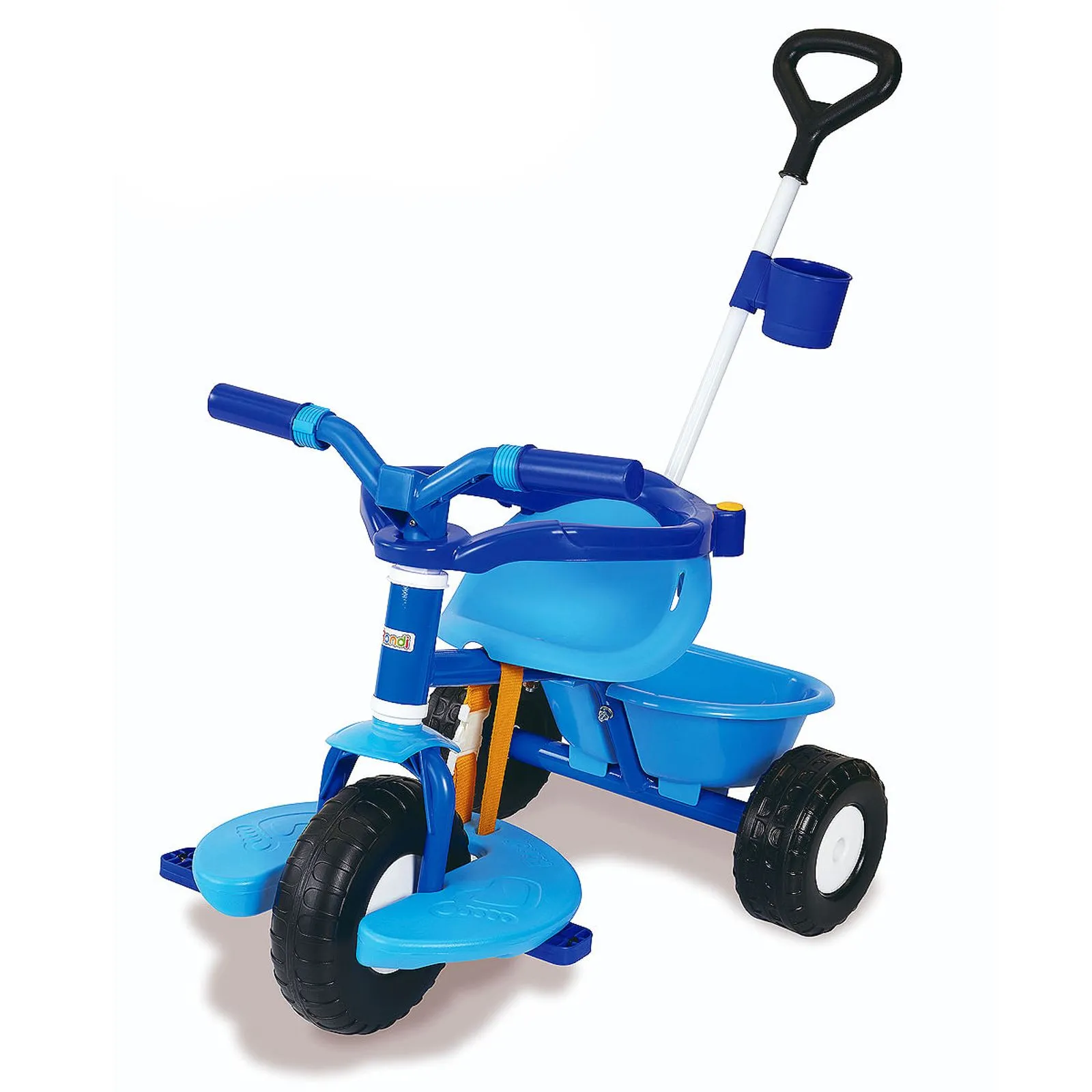 Con embrague, barra de arrastre, aro de contención, pedales antideslizantes, canasto trasero, apoya piés y porta mamaderas.