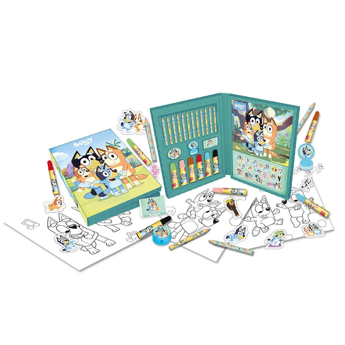 Incluye: 1 Valija plegable, 6 marcadores, 12 lápices de colores, 1 block de 20 hojas para colorear con imágenes de Bluey, 1 goma, 1 sacapuntas, 1 sello y stickers.
