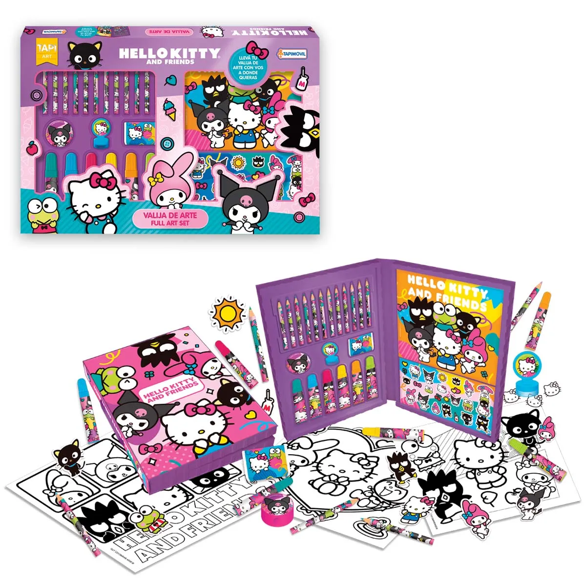 Incluye: 1 Valija plegable, 6 marcadores, 12 lápices de colores, 1 block de 20 hojas para colorear con imágenes de Hello kitty, 1 goma, 1 sacapuntas, 1 sello y stickers.